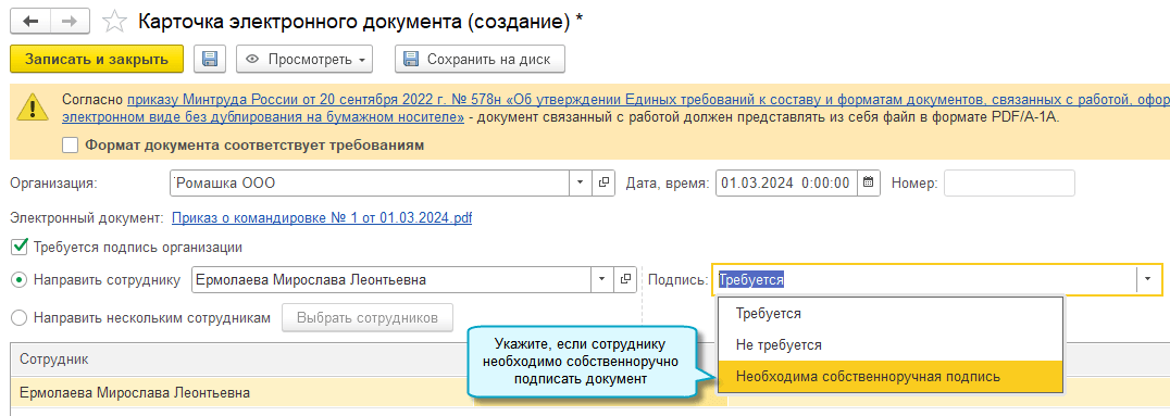 Добавлена возможность в документах кадрового ЭДО указать, что требуется не электронная, а собственноручная подпись сотрудника, или подпись не требуется совсем. Вариант подписания передается в личные кабинеты сотрудников.