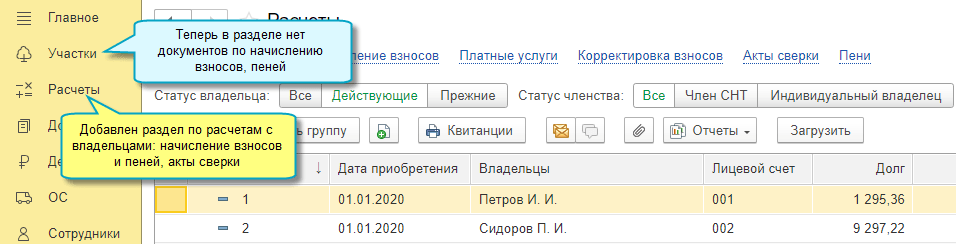 По участкам теперь ведется история владельцев, чтобы разделять долги новых и прежних владельцев. При начислении взносов учитывается дата приобретения участка.