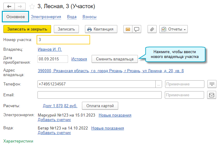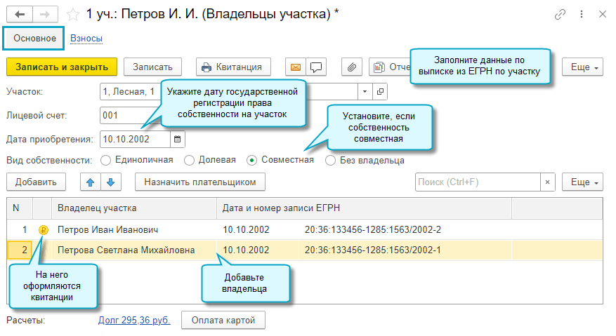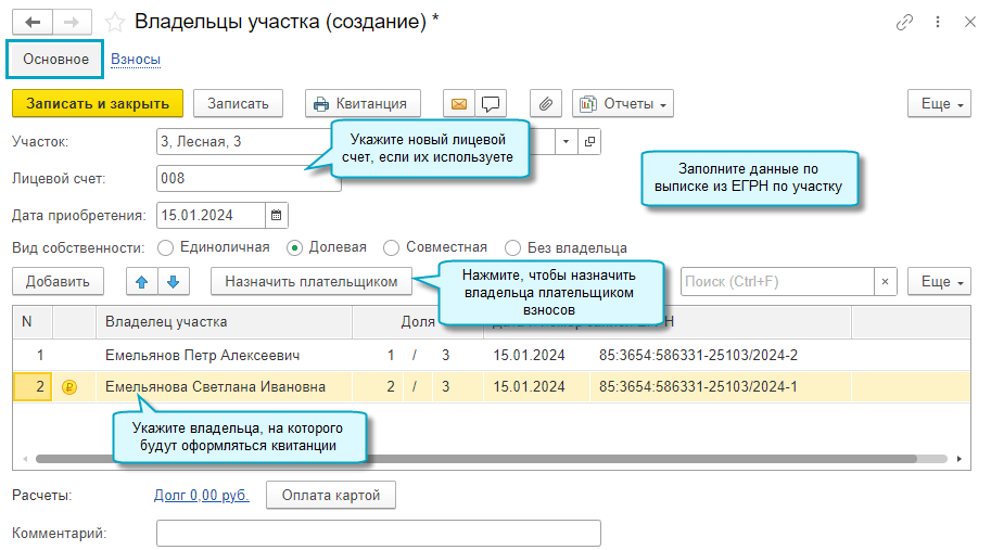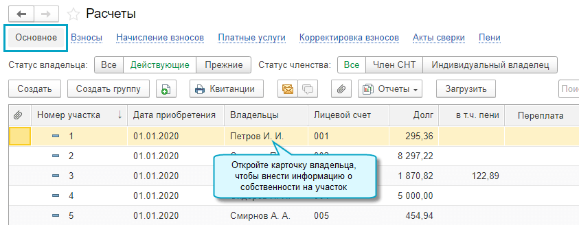 Добавлена возможность указать для участка несколько владельцев, когда он находится в совместной или долевой собственности. Квитанции при этом оформляются на одного из них, которого назначили плательщиком взносов по участку.