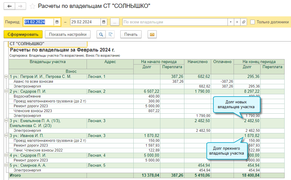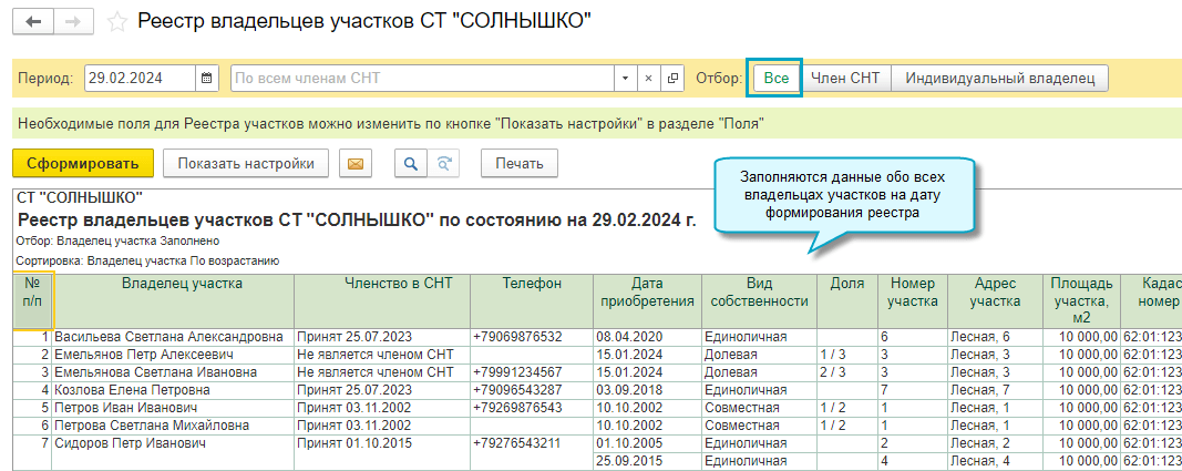 Также можно сформировать реестр владельцев участков на заданную дату и использовать его, например, при подготовке к собранию членов СНТ.