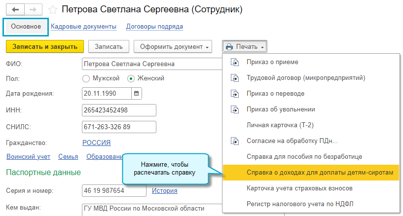 Добавлена возможность распечатать справку о доходах для назначения доплаты детям-сиротам,