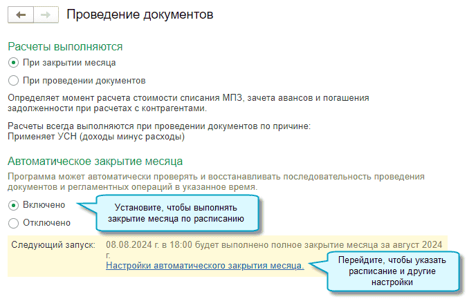 Простой интерфейс: меню "Настройки - Еще - Другие настройки - Администрирование - Проведение документов - Автоматическое закрытие месяца".