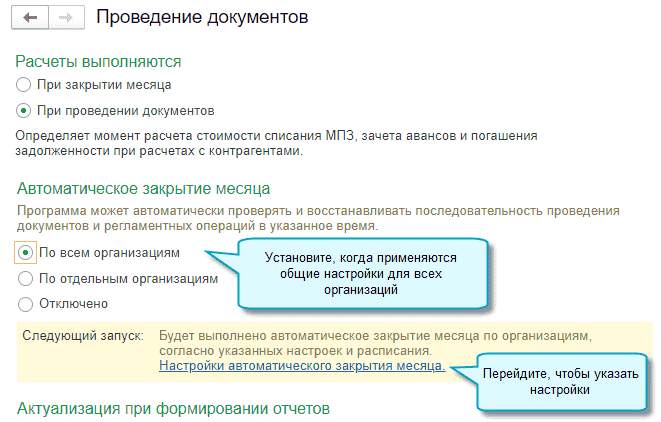 Перепроведение документов и закрытие месяца выполняются, начиная с этих дат, если они входят в разрешенный для изменений период, указанный в настройках автоматического закрытия, и не попадают под действие даты запрета изменений, установленной в настройках пользователей и прав. Иначе - выполнение останавливается.
