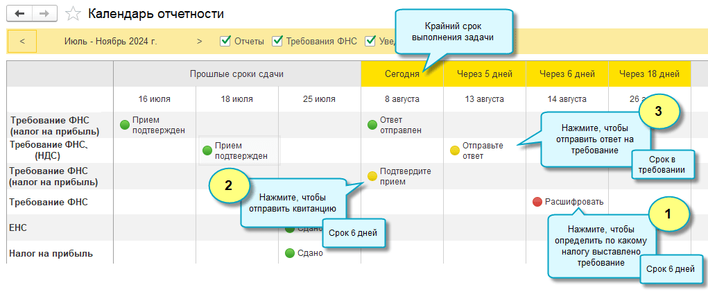 Требования ФНС, поступившие через сервис 1С-Отчетность, теперь отражаются в Календаре отчетности и Задачах организации.