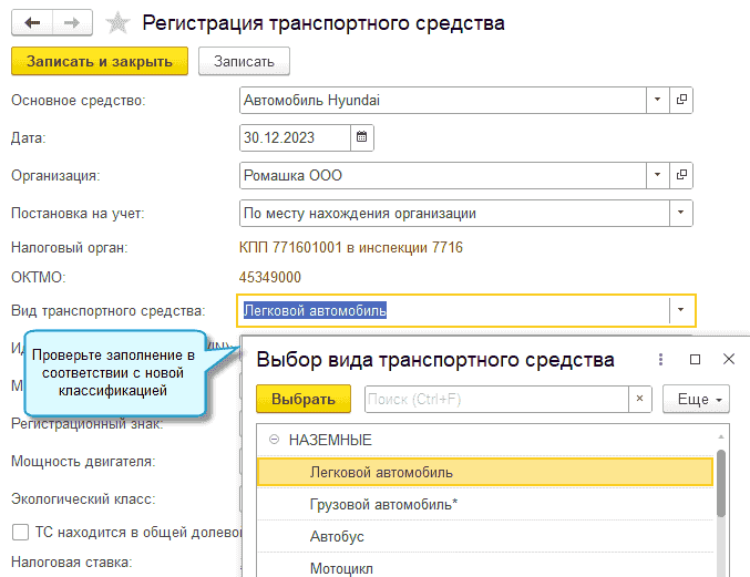 Простой интерфейс: меню "Налоги - Настройка налогов и отчетов - Транспортный налог - Регистрация транспортных средств".