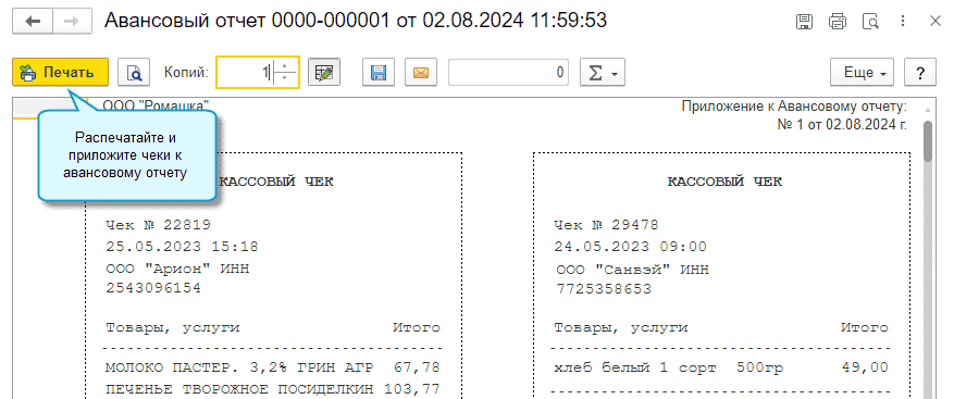 Добавлена возможность распечатать кассовые чеки, загруженные в документы Авансовый отчет, Авансовый отчет по командировке, Путевой лист, Расходы предпринимателя.