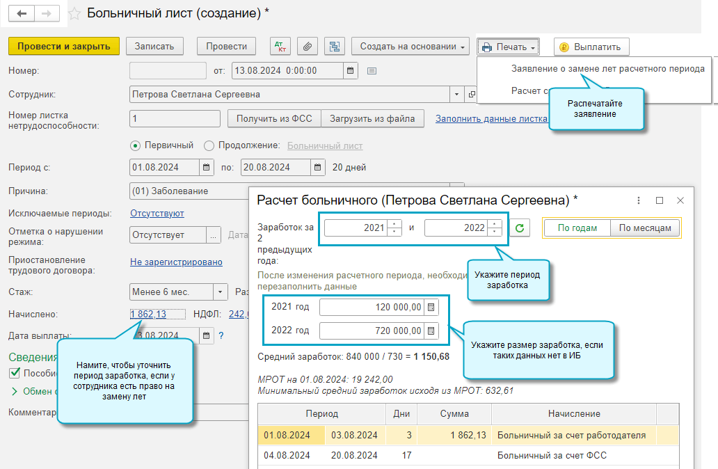 Добавлена возможность создать и распечатать Заявление о замене календарных лет в расчетном периоде для больничного листа (Приказ СФР от 22.04.2024 № 643). Это понадобится для тех сотрудников, которые имеют право на замену лет, например, вернувшиеся из декретного отпуска в течение двух последних лет.