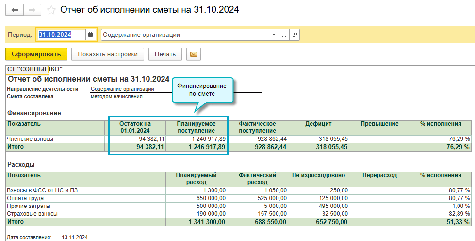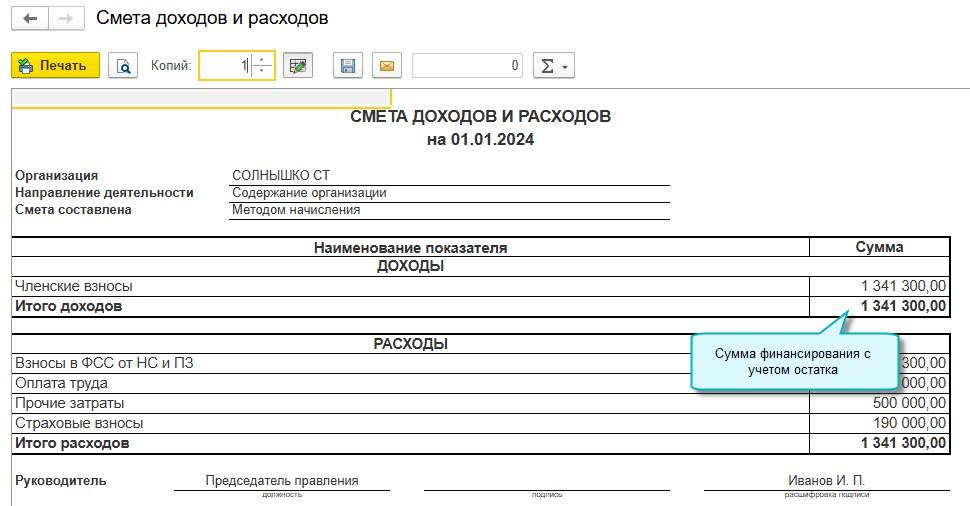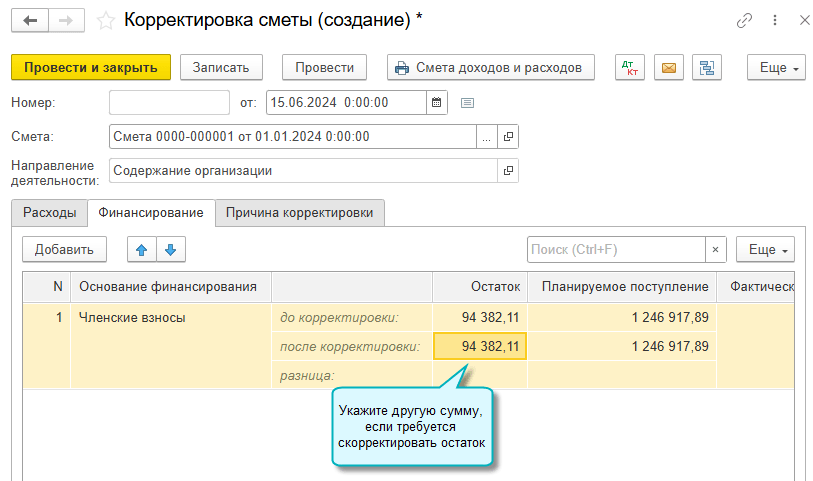Теперь при составлении сметы учитывается сумма финансирования, оставшаяся после закрытия предыдущей сметы по направлению деятельности. Например, остаток членских взносов на содержание организации по итогам прошлого года заполняется в смете на текущий год.