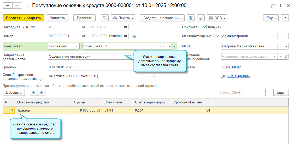 Добавлена возможность планировать расходы на покупку основных средств по смете, составленной методом начисления. Фактические расходы на приобретение основных средств отражаются в отчете об исполнении сметы.