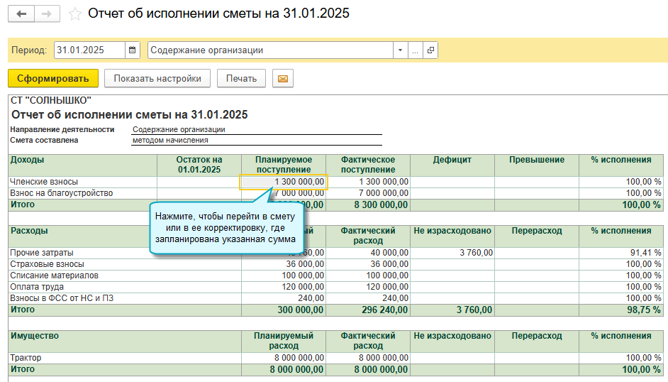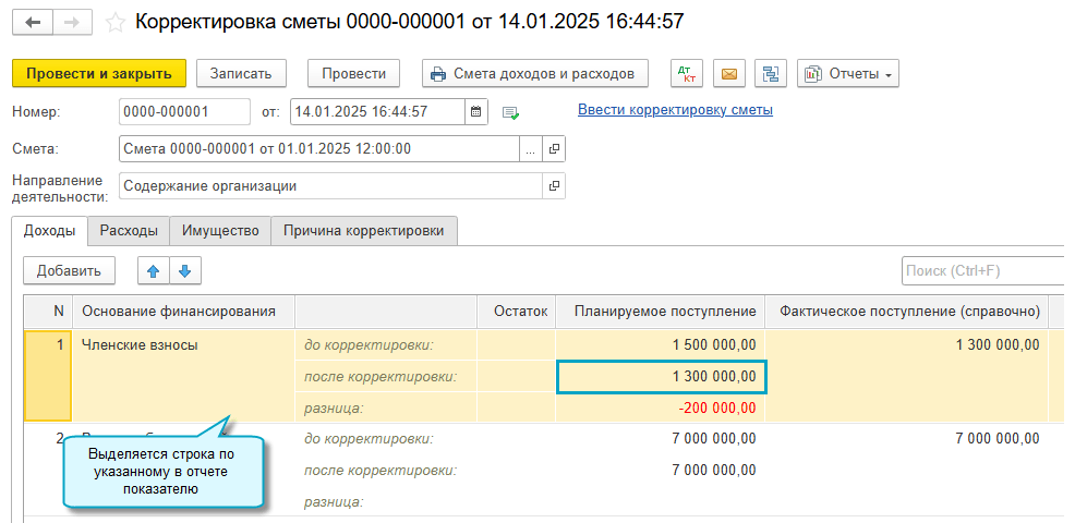 Теперь в отчетах по смете расшифровываются и плановые суммы. Открывается документ Смета, в котором запланирована сумма, а если в смету вносились корректировки - последний документ Корректировка сметы.