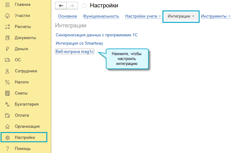 Простой интерфейс: меню "Настройки - Интеграции - Веб-витрина mag1c".