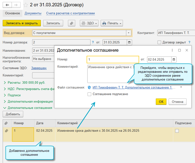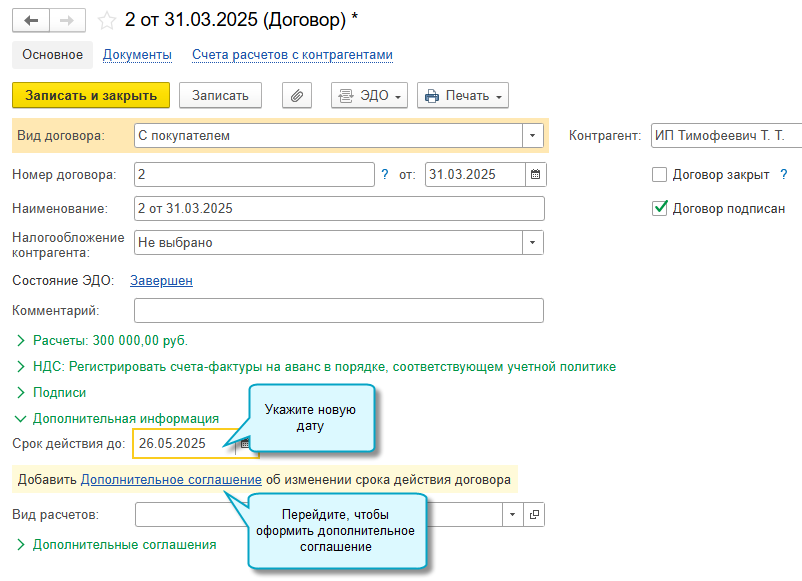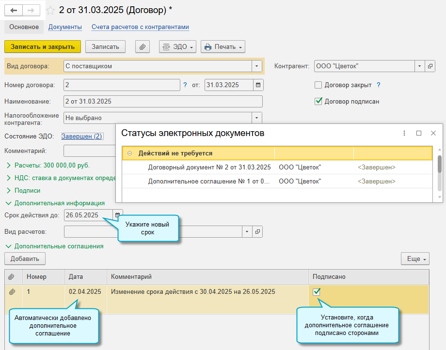 После получения дополнительного соглашения, подписанного другой стороной, откройте карточку договора и поставьте отметку о его подписании.