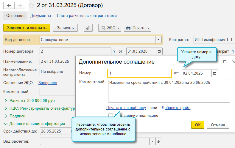 После утверждения, подписания и отправки дополнительного соглашения, откройте карточку договора, чтобы изменить его условия и поставить отметку о подписании дополнительного соглашения