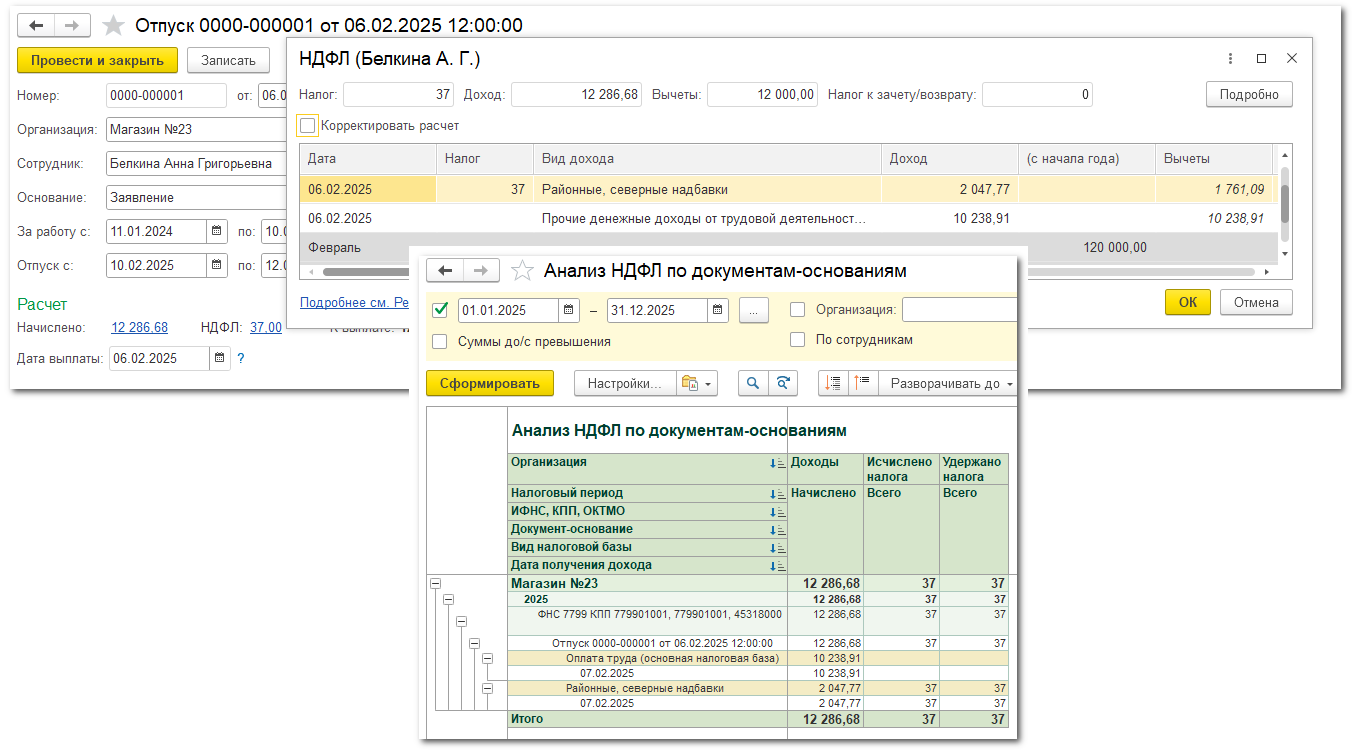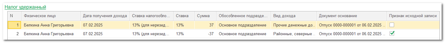 С базы "Районные, северные надбавки" на "основную" базу были перенесены доход, вычет и исчисленный налог в фактических размерах. Удержанный НДФЛ перенесен в размере исчисленного налога (но не более фактически удержанной в учете суммы).