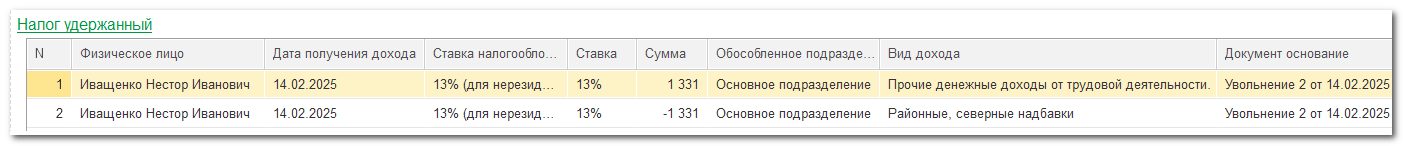На вкладке "Физические лица" по каждому сотруднику предварительно будут заполнены табличные части "Сведения о доходах", "Предоставленные вычеты", "Налог исчисленный", "Налог удержанный", в которых соответствующие суммы доходов, вычетов, исчисленного и удержанного налога переносятся с базы "Районные, северные надбавки" на "основную" налоговую базу.