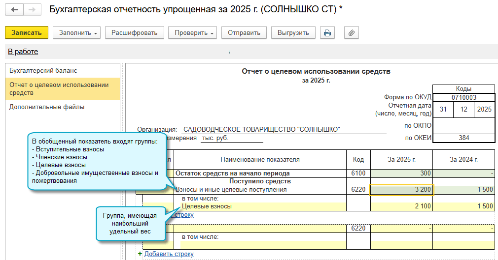 Добавлено автозаполнение упрощенного отчета об использовании целевых средств по форме, разработанной на основе образца, приведенного в ФСБУ 4/2023 "Бухгалтерская (финансовая) отчетность". Применяется форма начиная с отчетности за 2025 год.