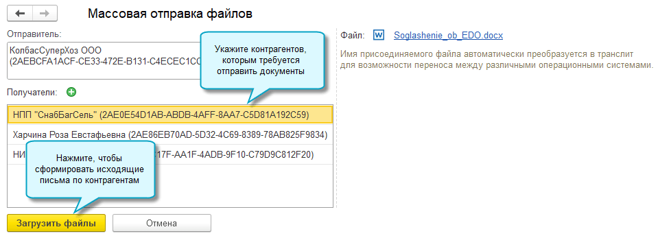 Используйте массовую отправку, чтобы разослать подготовленные документы контрагентам.