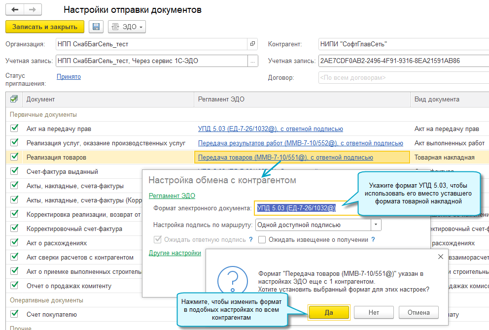 Вносите изменения в настройки отправки документов по мере перехода на применение УПД 5.03.