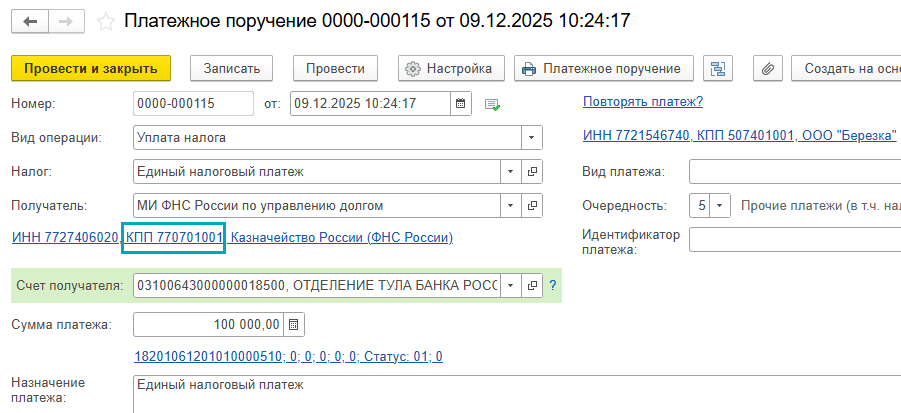 С 05.12.2025 в платежных получениях на уплату единого налогового платежа для Казначейства России заполняется КПП 770701001. Подробнее ...