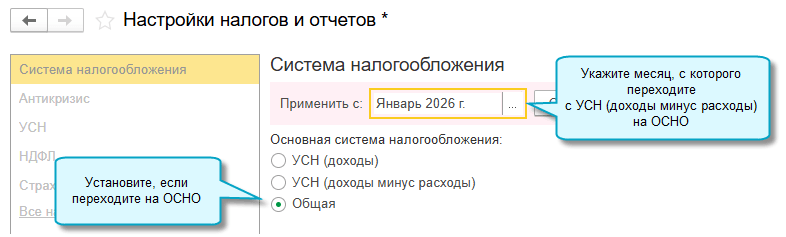 Простой интерфейс: меню "Организация - Налоги и отчеты - Система налогообложения".