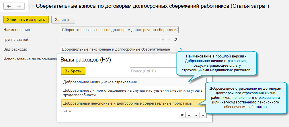 Используйте вид расходов "Добровольные пенсионные и долгосрочные сберегательные программы" для затрат на добровольное страхование по договорам долгосрочного страхования жизни работников, пенсионного страхования и (или) негосударственного пенсионного обеспечения работников, а с 01.01.2025 и для сберегательных взносов организации по договорам долгосрочных сбережений работников.