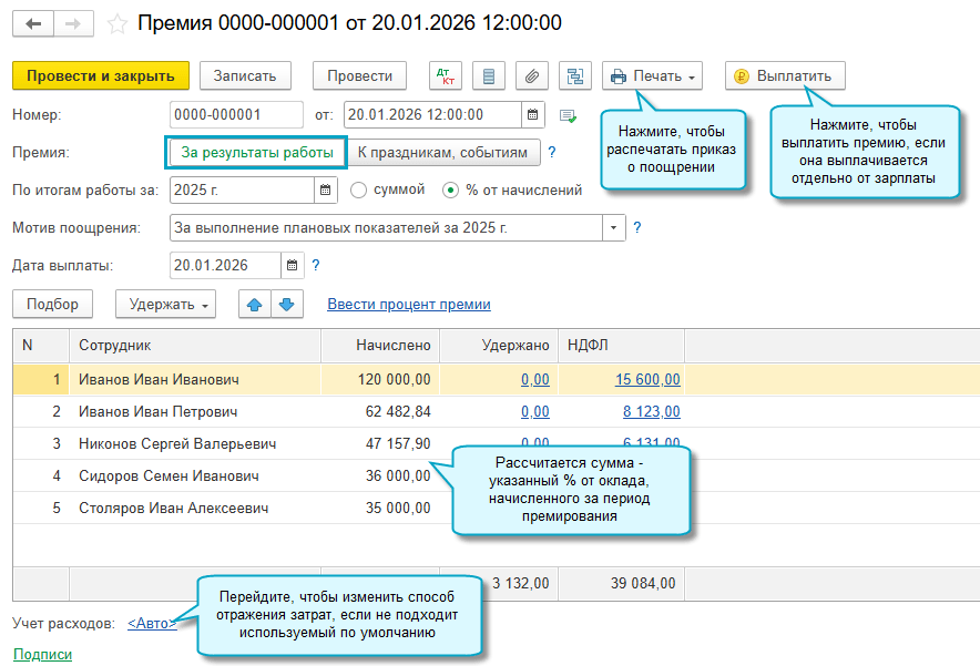Добавлен специальный документ для начисления премий и печати приказов о поощрении.