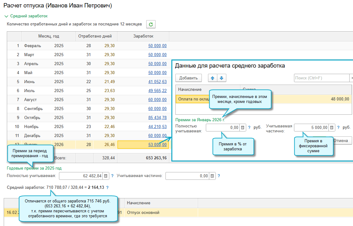 Чтобы посмотреть полный расчет отпускных, распечатайте расчет среднего заработка.
