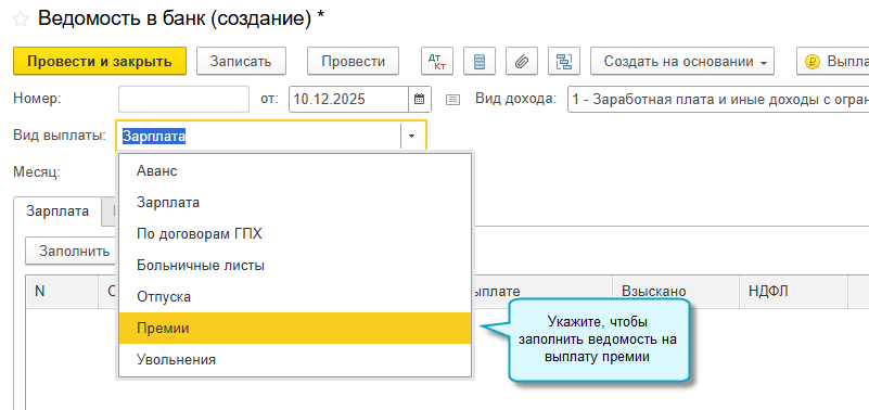 Простой интерфейс: меню "Сотрудники - Выплаты - Ведомость в банк".