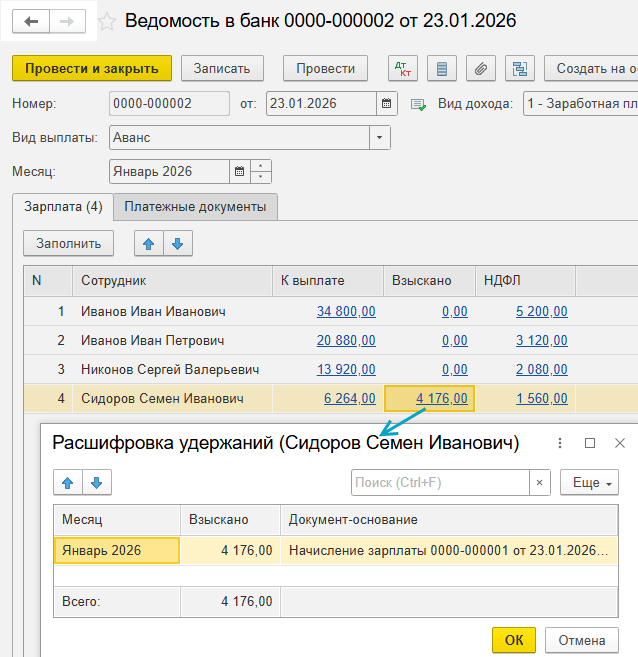 Удержанные суммы теперь расшифровываются в ведомостях по документам, в которых проводилось удержание.