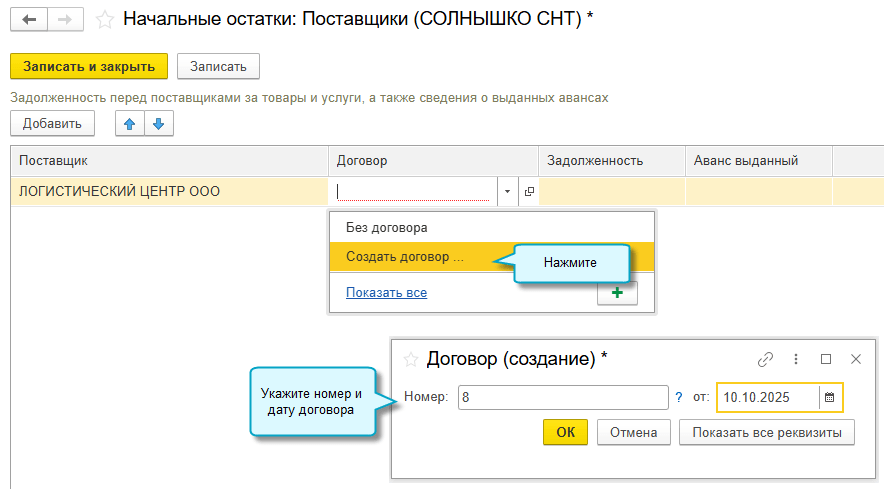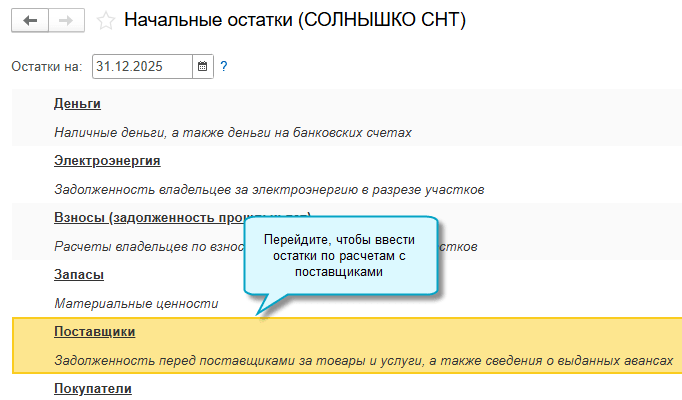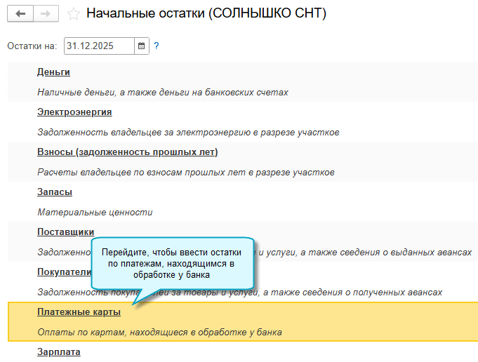 В упрощенном интерфейсе помощника по вводу начальных остатков добавлена возможность заполнять данные по контрагентам и договорам в сокращенном варианте - только те реквизиты, которые достаточны для ввода остатков. Добавлена возможность ввести начальные остатки по платежам владельцев участков и покупателей по платежным картам.