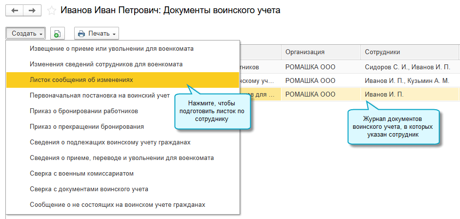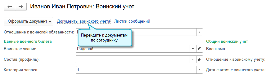 Добавлена возможность из карточки сотрудника посмотреть все документы воинского учета, в которых он указан, и подготовить новые документы.