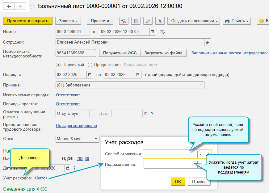 Теперь для расходов на оплату больничного листа можно задать свой способ учета и подразделение, например, при оплате больничного работающим по договорам подряда.