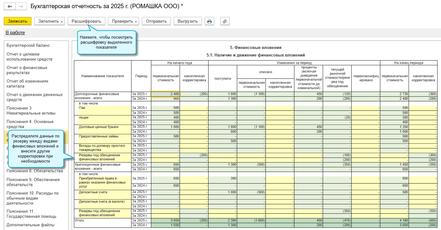Показатели по резерву под обесценение финансовых вложений заполняются в целом по долгосрочным и краткосрочным финансовым вложениям. Между видами финансовых вложений потребуется его распределить самостоятельно.
