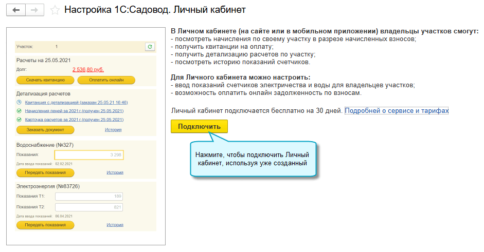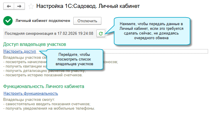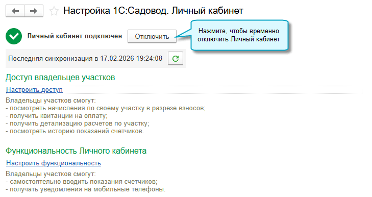 Добавлена возможность временно отключать обмен с 1С:Садовод.Личный кабинет, например, при переходе в другое приложение 1С:Садовод. Настройки доступа у садоводов сохраняются. При повторном подключении достаточно выбрать ранее созданный Личный кабинет.
