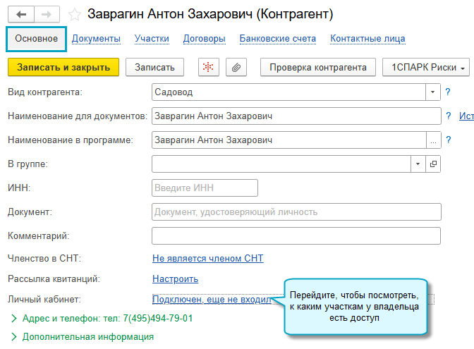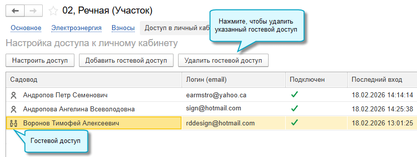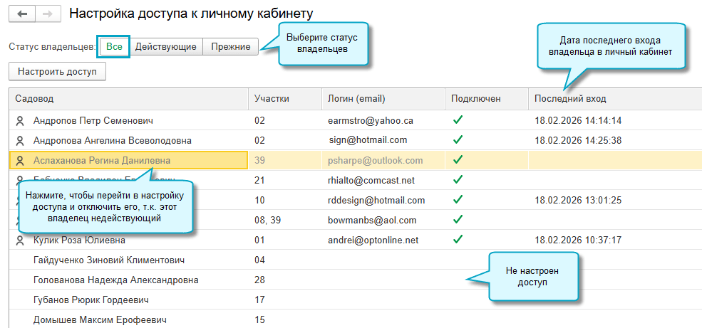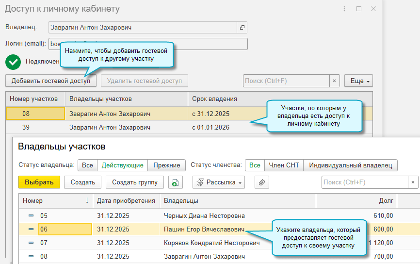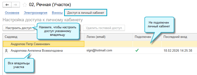 В карточке участка можно посмотреть, кто подключен к личному кабинету по этому участку. А в карточке владельца - посмотреть, к каким участкам у него есть доступ.