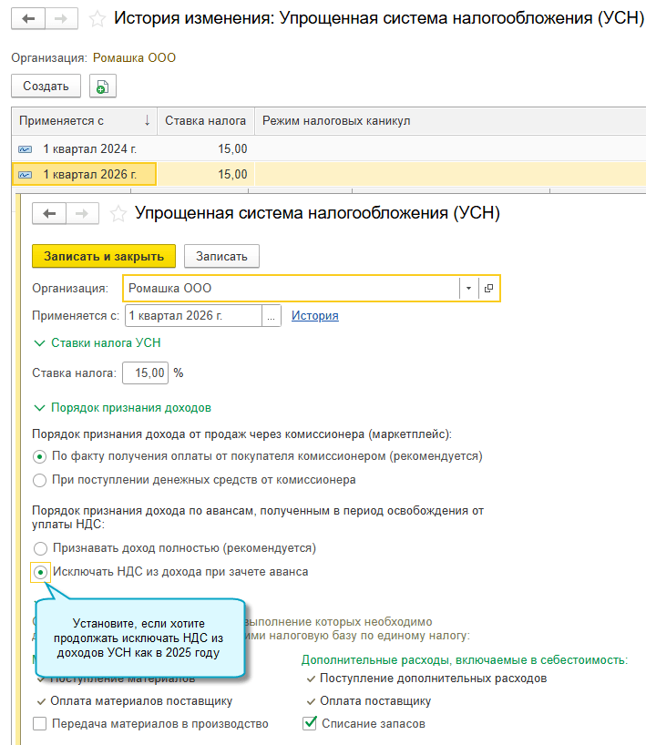 Чтобы продолжать использовать способ "исключать НДС из дохода при зачете аванса" как в 2025 году, потребуется изменить следующую настройку: