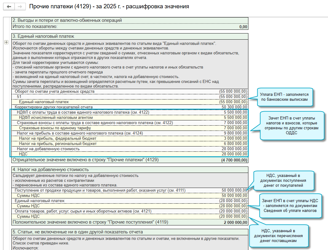 Расшифровка уплаты ЕНП будет другая, если в банковских выписках не использовалась статья "Единый налоговый платеж". Перечень статей ДДС тогда определяется по счету 68.90 "Единый налоговый счет".