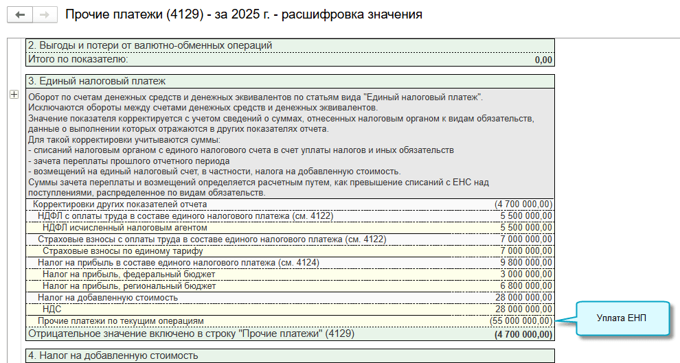 Если сумма перечисленного в бюджет ЕНП больше суммы уплаченных налогов, то разница отражается в составе прочих платежей по текущим операциям (код строки 4129).