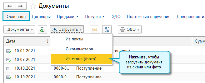 Простой интерфейс: меню "Документы - Основное - Загрузить - Из скана (фото)".