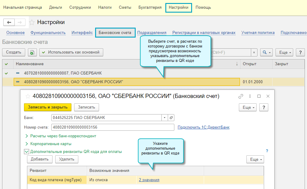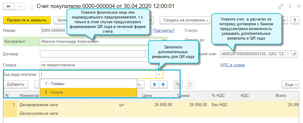 Добавлена возможность заполнять дополнительные реквизиты платежа в QR коде счета покупателю. Для тех организаций и индивидуальных предпринимателей, у которых в договоре с банком предусмотрена возможность указать дополнительные реквизиты в QR коде. Например, вид платежа, имя, фамилия, отчество плательщика. Тогда выгрузка банка по таким платежам будет содержать сведения, необходимые для полного отражения оплаты в учете.