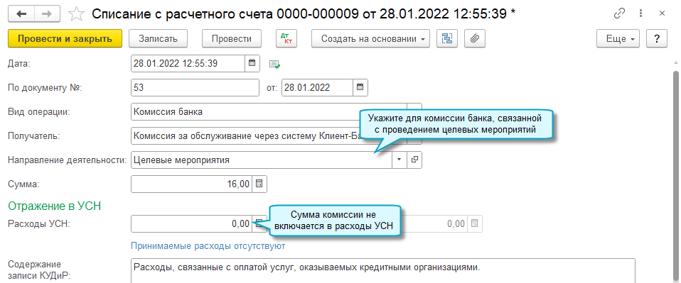 Добавлена возможность учитывать комиссии банка по направлениям деятельности, к которым они относятся. При этом в расходы УСН включаются только комиссии банка по предпринимательской деятельности.