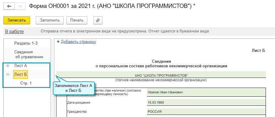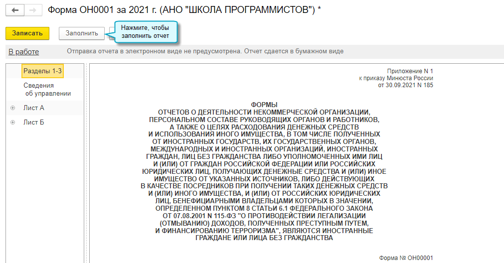 Добавлено автозаполнение отчета о деятельности некоммерческой организации и о персональном составе ее руководящих органов и работников (форма № ОН0001). Отчет представляется в Минюст России ежегодно не позднее 15 апреля года, следующего за отчетным, начиная с отчета за 2021 год (Приказ Минюста России от 30.09.2021 № 185).