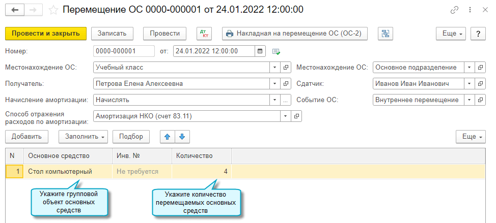 Полный интерфейс: меню "ОС и НМА - Учет основных средств - Перемещение ОС".