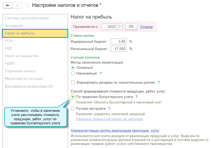 Добавлена возможность быстро настроить перечень прямых расходов для налогового учета по налогу на прибыль по правилам бухгалтерского учета. Для этого достаточно сделать следующую настройку:
