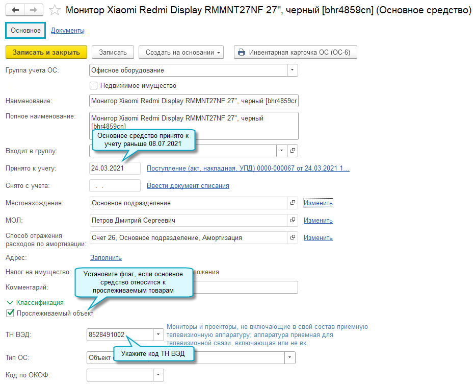 Добавлена возможность заполнить уведомления на получение РНПТ на остатки прослеживаемых основных средств и прослеживаемых комплектующих основных средств. Уведомление заполняется по основным средствам, если они или их комплектующие относятся к прослеживаемым товарам, но приняты к учету раньше 08.07.2021 (даты начала действия национальной системы прослеживаемости товаров).