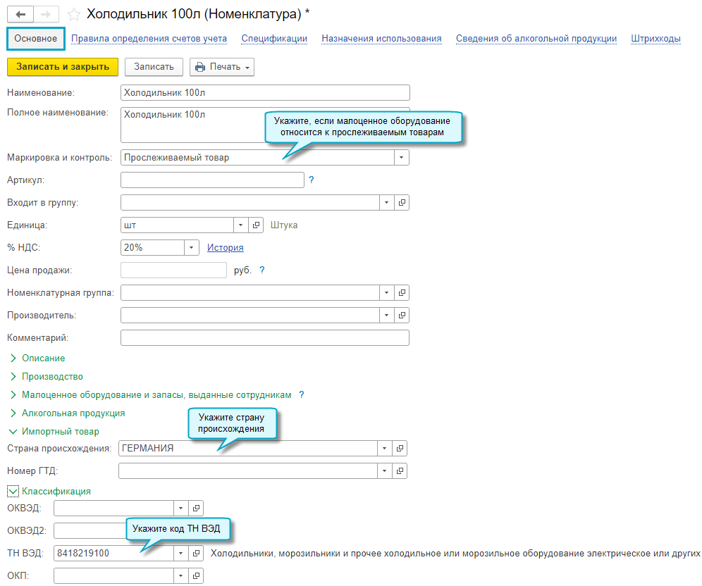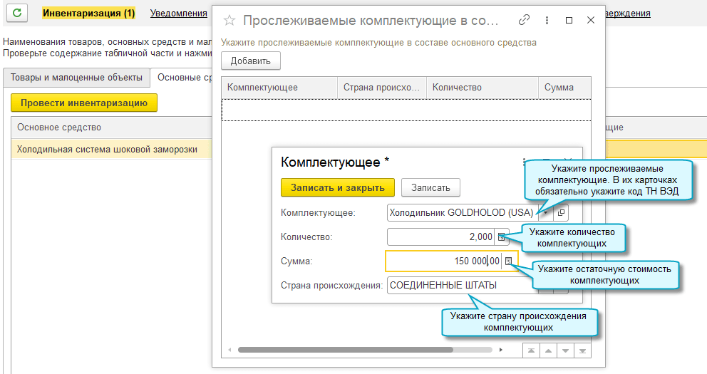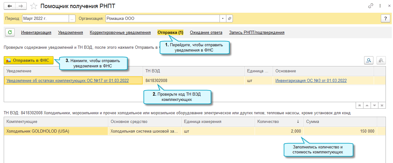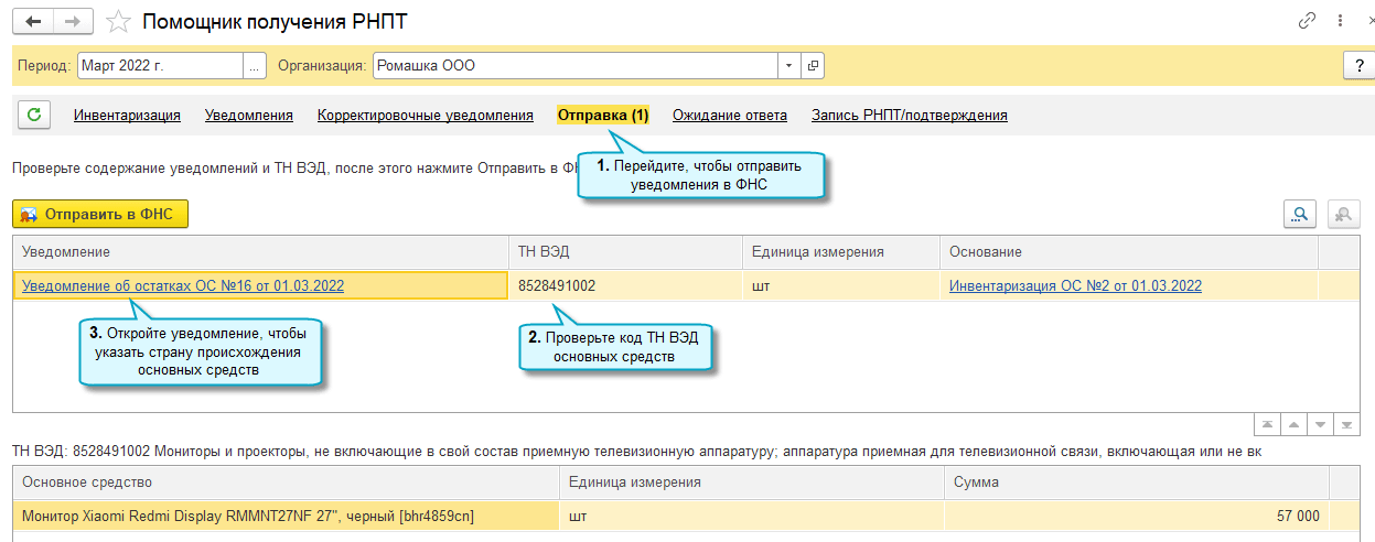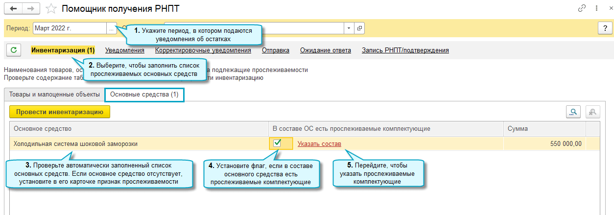 Для основных средств, в составе которых есть прослеживаемые комплектующие, в уведомлении необходимо вручную указать остаточную стоимость этих комплектующих. Рекомендуется рассчитать её исходя из доли стоимости комплектующих в стоимости основного средства (Письмо ФНС России от 01.09.2021 № ЕА-4-15/12338@).