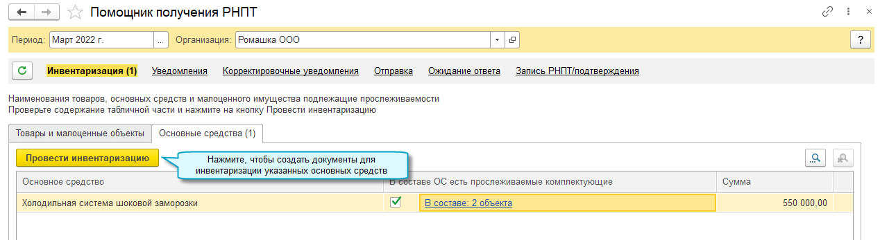 Для прослеживаемых основных средств в уведомлении автоматически заполняется их остаточная стоимость.