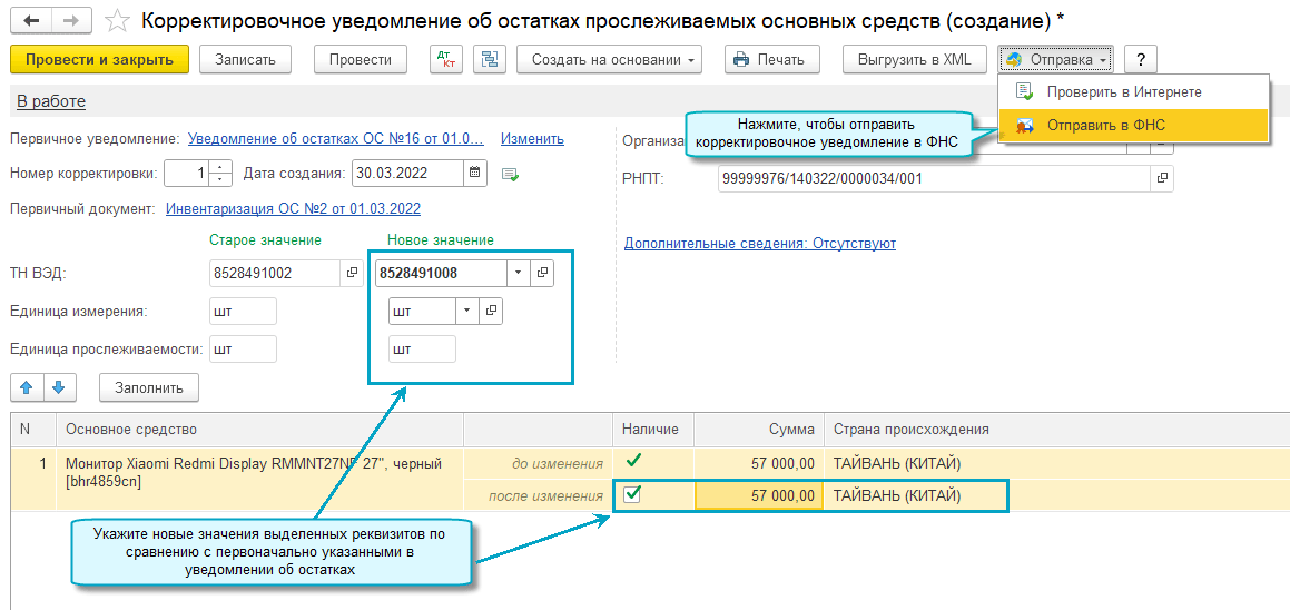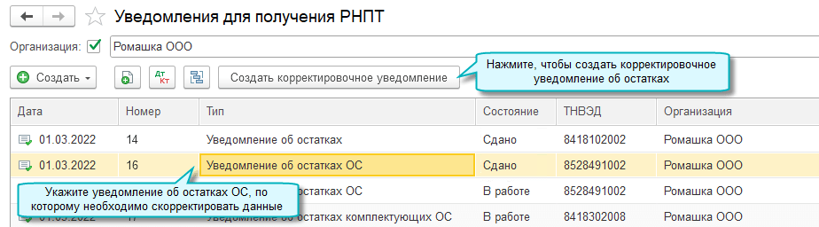 Аналогично создается Корректировочное уведомление об остатках прослеживаемых комплектующих ОС.