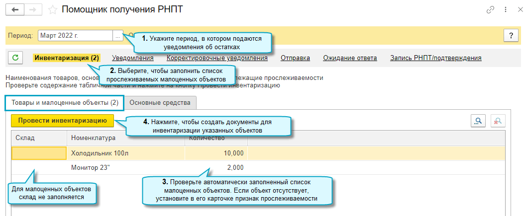 Добавлена возможность заполнить уведомления на получение РНПТ на остатки малоценных объектов, учтенных на счете МЦ.04 "Инвентарь и