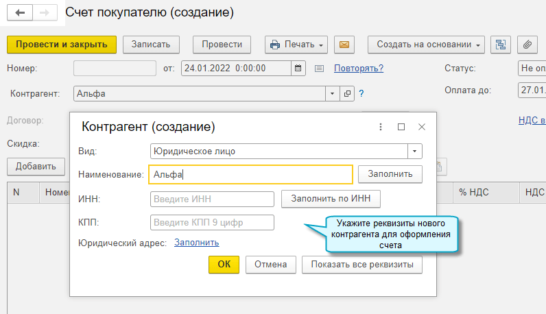 Для быстрого оформления счета, платежного поручения или других документов по новому контрагенту теперь можно заполнять только те реквизиты контрагента, которые необходимы для конкретного документа. Функционал доступен в простом интерфейсе.